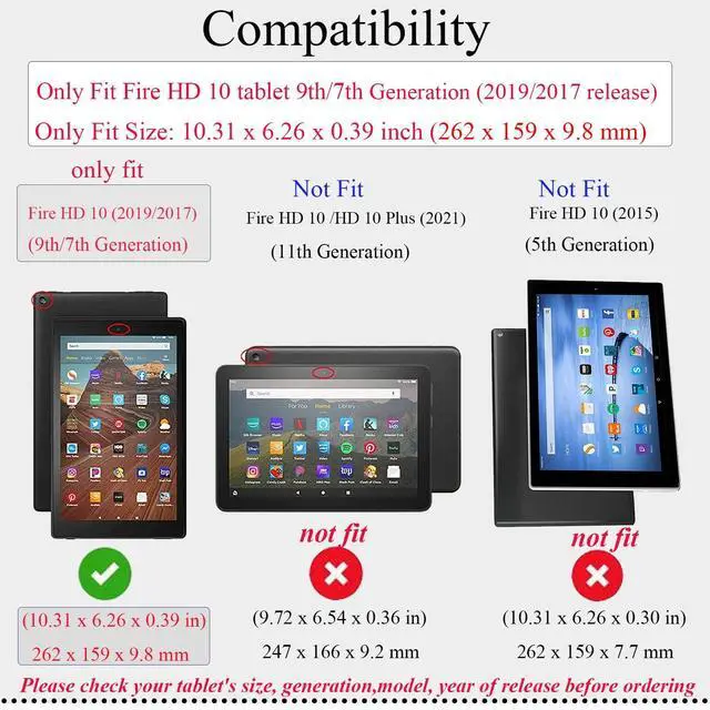 Fits Your Tablet: for Kindle Fire HD 10 (9th Generation, 2019 release), 10.1 inchfor Kindle Fire HD 10 (7th Generation, 2017 release), 10.1 inch NOT compatible with other kindle Fire tablet models.