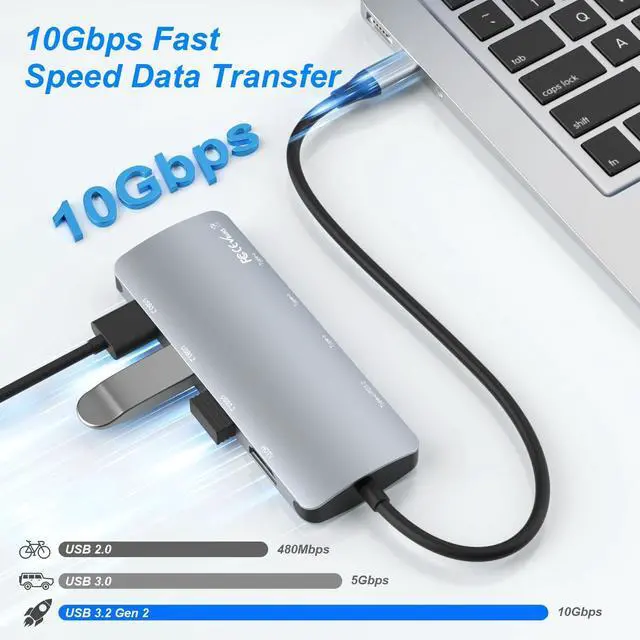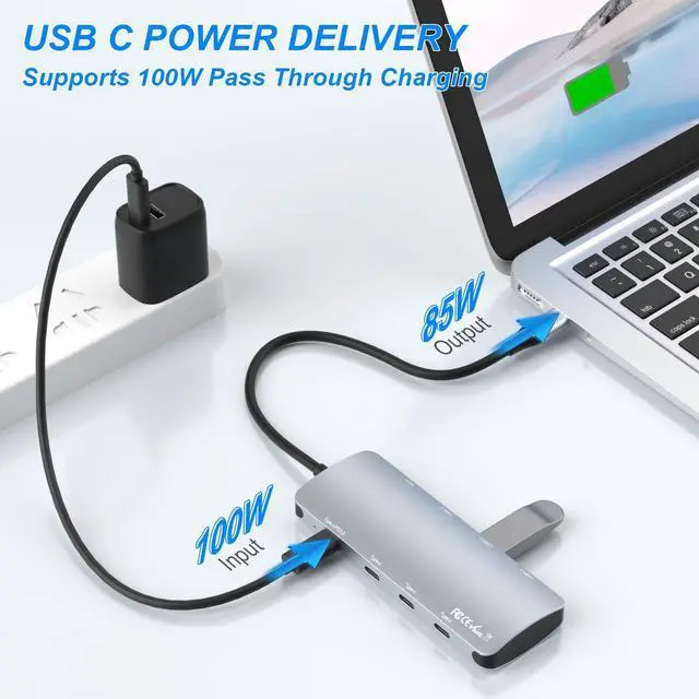 ^^ [10Gbps High Speed Data Transfer] USB 3.2 Gen2 USB C hub features 4*USB C and 3*USB data ports, providing file transfer speeds up to 10 Gbps. Can be used to connect multiple USB devices such as flash drives, hard drives, keyboards, mice, printers, game controllers, and more. ^^ [100W Power Delivery] This Multiport USB C Adapter is compatible with USB-C Power Delivery, charging your MacBook Pro and Air or other type-c devices when connected to the 100W Power Delivery port and providing high-speed pass-through charging up to 85W.