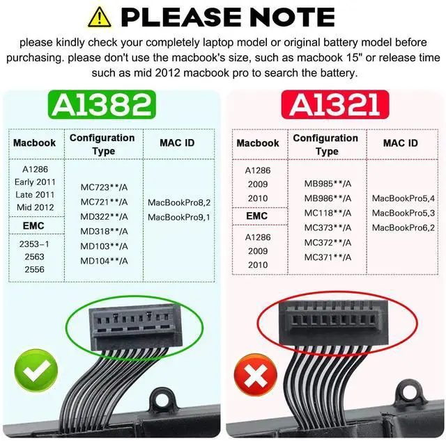 Please note: This is A1382 battery and DO NOT fit for MID 2009, EARLY 2010, LATE2010 (A1286) ^^ Replacement A1382 Battery for MacBook Pro 15 inch [A1286 Core i7 versions] - (Early 2011 versions, Late 2011 versions, Mid 2012) MC721LL/A, MC723LL/A, MD035LL/A, MD318LL/A, MD322LL/A, MD103LL/A, MD104LL/A, BTO/CTO ^^ Easy to install. There are 2 screwdrivers in the package. Enough to install the new battery for your MacBook. ^^ Built-in circuit protection ensures both safety and stability. Over charger circuit protection.