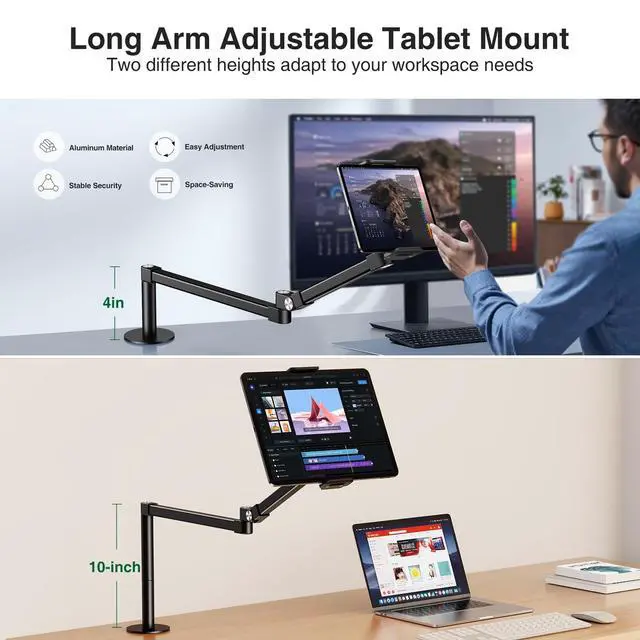 Space-Saving Grommet MountThis iPad arm mount for desk installs instantly via grommet hole, fitting vast majority of office desks, study desks or any other desks (grommet holes 3.4" wide, thickness up to 2.5" ). You can also drill a small hole ANYWHERE on your desk for instant grommet-base mounting. Break free from edge limits! Position your iPad arm exactly where needed. This streamlined design frees up 80% more workspace than bulky standsmaking room for keyboards, mice, and tools. ^^ Extended Reach for Versatile Use711 mm / 28 in horizontal reach covers large desks, rise your devices up to 508 mm / 20 in vertical (with extension arm), this iPad desk mount effortlessly positions your iPad anywhere at any angle.