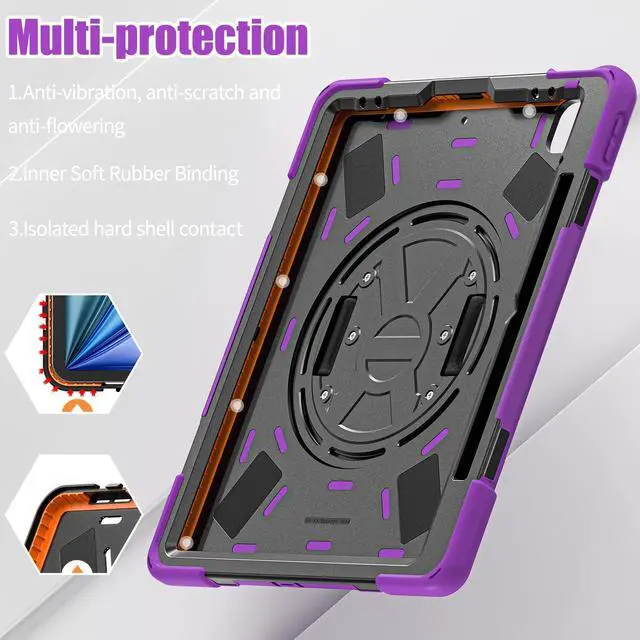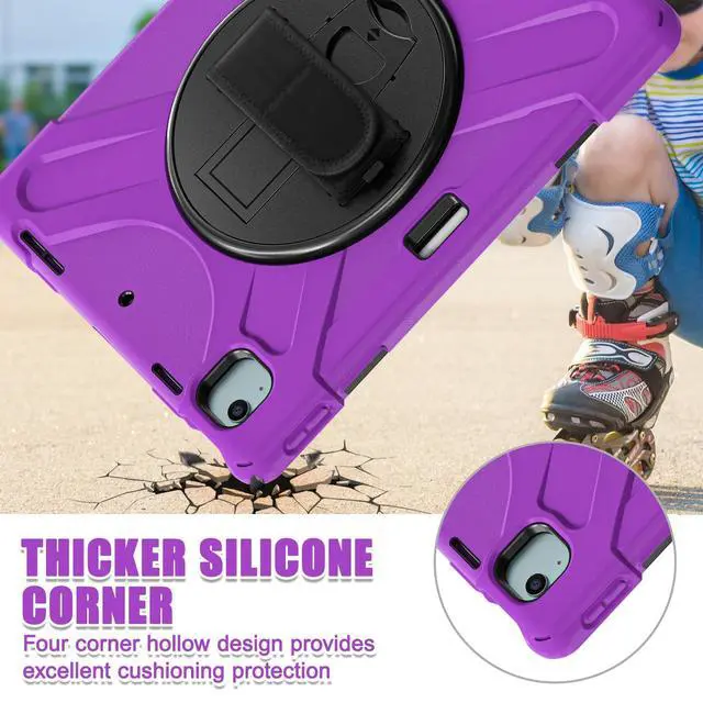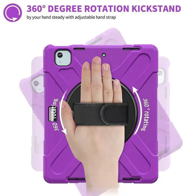 Hand Strap Design: With a 360 rotating hand strap design, this case offers versatile handling options, allowing you to comfortably carry your iPad Air in any orientation, making it ideal for on-the-go use. ^^ Foldable Portable Stand and