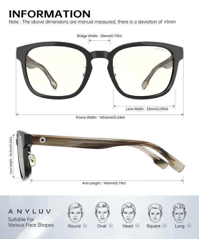 ^^ Superior Comfort: The design of the blue light glasses is combined with ergonomics. Distribute the pressure on the frame and reduce the pressure on your ears and nose bridge. In addition, the lightweight material and soft nose pad design allow the blue light glasses blocking to conform to the shape of the face. You'll be able to enjoy a comfortable experience during long periods of time on the electronic devices. ^^ Brand Customer Service & Gift Package: This type of blue ray glasses come with an exquisite triangular folding box, which will be a great gift for your family and friends! ANYLUV attaches great importance to product quality and customer satisfaction. Each ANYLUV customer can enjoy after-sale brand service for our blue screen glasses.