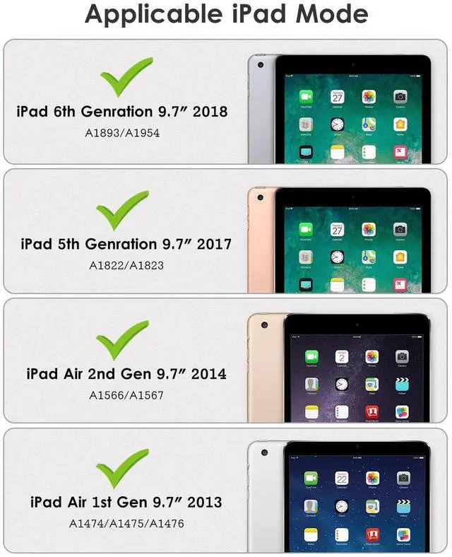 Compatibility Model: The Case is compatible with Apple 9.7 inch iPad 6th / 5th Generation (2017 / 2018 released) model: A1822/A1823/A1893/A1954; Apple 9.7 inch iPad Air 2nd / 1st (2014 / 2013 released) model: A1474/A1475/A1476/A1566/A1567, Not compatible with any other iPad devices. ^^ New Upgraded