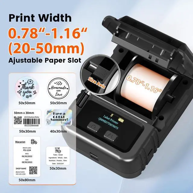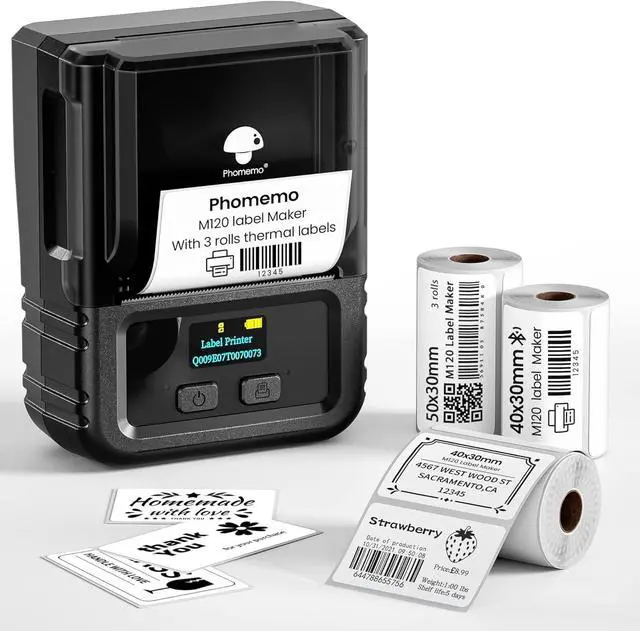 Lightweight & Ultra-PortablePhomemo M120 label maker Weighing just 200g, is your go-anywhere labeling companionslipping effortlessly into pockets or backpacks. A single charge delivers 3, 000 labels, so you can print on the fly without worrying about battery life. Plus, this thermal label printer have auto-sleep mode conserves power by shutting down after 5 minutes of inactivity. ^^ Versatile & Easy to UseM120 barcode label printer with 3 rolls more thermal labels: 2 roll 1.57" 1.18" 40x30mm+ 1 roll 1.96" 1.18" 50x30mm), this label printer supports 20-50mm label sizes, with an adjustable paper slot and built-in sizing guide for quick calibration. Print barcodes, QR codes, addresses, names, jar labels, food labels, storage tags, holiday stickers, and moreGreat for home organization, small businesses, or crafting. ^^ Smart App with AI RecognitionBoost productivity with the Phomemo "Print Master" App, equipped with voice and image recognition (OCR) for effortless text conversion, one-tap printing for barcodes and custom designs, and a vast library of 7000+ symbols, 200+ templates, and 660+ fonts across 20+ languages for limitless creativity. ^^ Seamless CompatibilityThe M120 label maker for small business works seamlessly across iOS, Android, and PCmobile users enjoy wireless Bluetooth printing, while PC users can easily connect via USB with the "Labelife" software (includes step-by-step setup guide). ^^ Crisp, Ink-Free