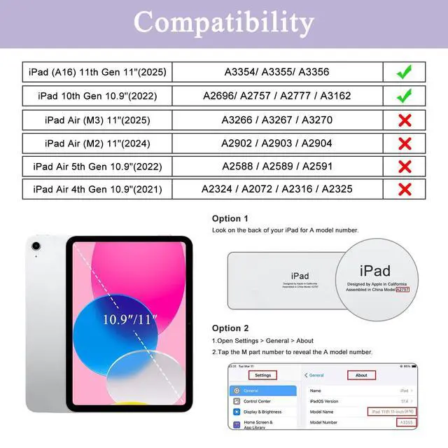 • [COMPATIBILITY]: Exclusively designed for Newest iPad (A16) 11th generation 11 inch 2025(Model Number: A3354/A3355/A3356) & iPad 10th generation 10.9 inch 2022(Model Number: A2696/A2757/A2777/A3162).Not fit any other iPad models.Please check back bottom of your iPad to find the model number