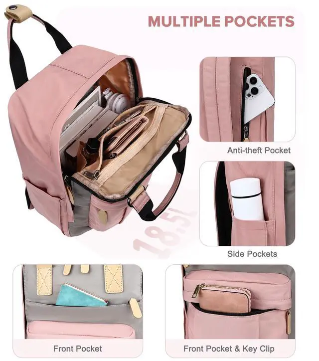 Well Organization: The padded laptop compartment keeps your laptop safe, the main compartment fits you binders, A4 files, textbooks. There are 1 slip pocket, 2 mesh zipper pockets and 2 internal side pockets inside the bag for your personal belongings. Front zipper compartment is designed for quick access to your necessaries. One outer zipper front pocket is with a key clip and there is also a secured pocket on the back for your wallet. Two side external pockets for your bottle and umbrella.
