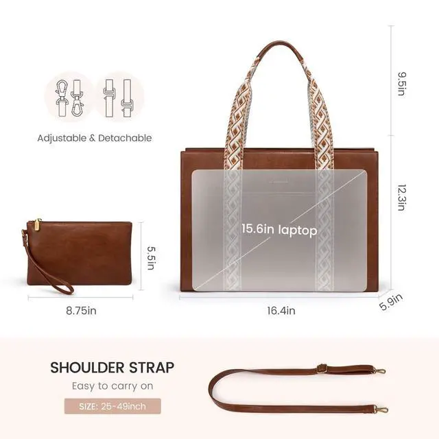 Perfect Size Women's Briefcase: Measuring 16.4" L x 5.9" W x 12.3" H and weighing just 2.67 lbs, this women's computer tote bag combines style and utility. It features adjustable shoulder straps and a secure top zipper. Included is a 8.7" L x 7.3" H pouch for coins, cosmetics, passports, and phones. Versatile in function, it serves as a ladies' briefcase, teacher tote bag, computer bag, or crossbody work bag. ^^ Premium Durable