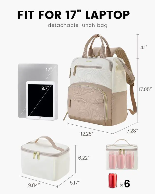 Insulated Lunch BagThis work backpack comes with a detachable insulated lunch box. It keeps food cold, hot, or fresh for about 4-8 hours, perfect for nurses, teachers, and professionals ^^ WIDE OPENINGMeasuring 12.28 '' L x 7.28 '' W x 17.05 '' H, this lunch backpack features a wide opening for easy access, allowing you to quickly find your items in seconds ^^ Laptop CompartmentThe insulated backpack includes a 17-inch laptop compartment and a 12.9 -inch iPad tablet pouch, providing excellent protection and making it ideal for on-the-go electronics ^^ 2 Front PocketsThe laptop backpack is designed with dual front pockets for quick access to your phone, charger, cards, and other small items, making them easy to locate and retrieve ^^ Luggage Strap & Anti-Theft PocketThis cooler backpack has a luggage strap for securing to your suitcase and a back zippered pocket for safely storing valuables like your passport and wallet ^^ Sturdy Zipper & Shoulder StrapThe metal zipper slider ensures durability, and double-layered stitching on the shoulder straps adds reliability for rush hour commuting and traveling ^^ Versatile BackpackThe meal prep backpack for women can be used for work, college, traveling, and business trips.