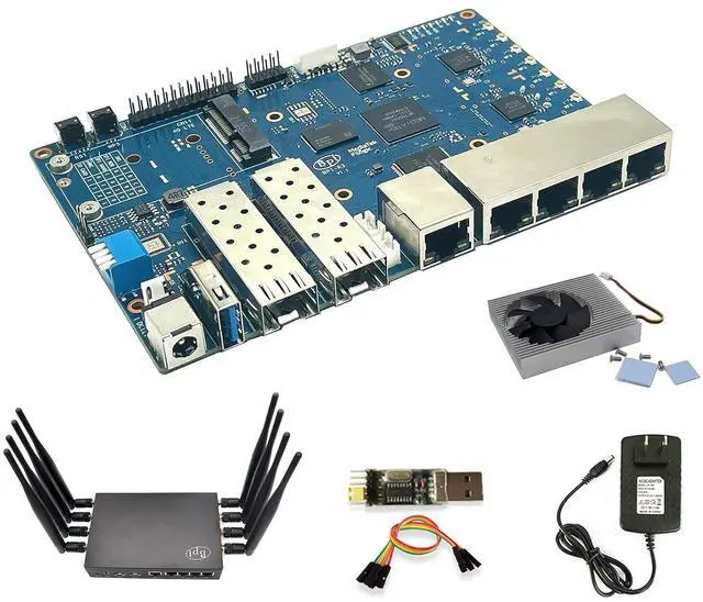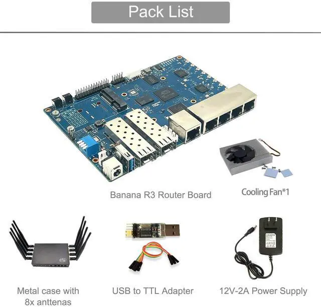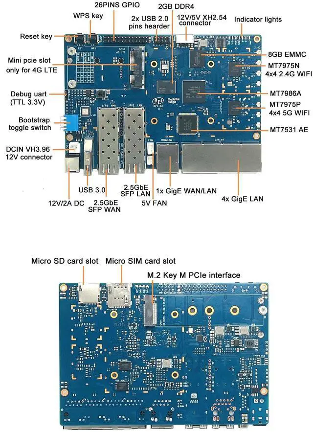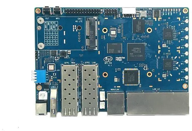 [MediaTek CPU Built in Filogic 830 chip ] Banana Pi BPI-R3 Router board with MediaTek MT7986 (Filogic 830) quad core ARM A53 + MT7531A chip design. Filogic 830? s built-in hardware acceleration engine enables fast and reliable Wi-Fi offloading and wireless network connection, suitable for games, AR/VR and other low-latency applications ^^ [Strong Network Communication Capability] On-board 5x 1000Mbps RJ45 Ethernet, 2x SFP 2.5G bE port ^^ [Low-latency Wi-Fi 6 Connection] Wi-Fi 6 2.4G wifi use MT7975N and 5G wifi use MT7975P, which has many advantages over its predecessors, including lower latency, larger bandwidth capacity and faster transmission rates.