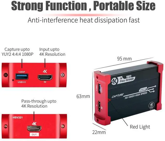 YUY2 4:4: 4 1080P With 60FPSThe HD video capture card can support 1080P with 60FPS, it is very suitable to use it for game live streaming. ^^ Faster Data TransmitionUSB 3.0 high speed transmission port, let your live streaming to Twitch, Youtube, OBS, Potplayer and VLC more easily. ^^ Plug and Play, No Need to Install DriverIt is compatible with Linux, Mac OS, windows 7/8/10, very easy to setup, there is no need to install driver.