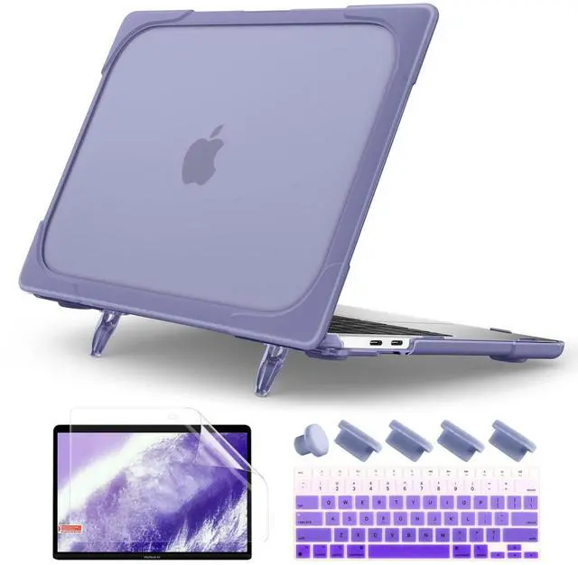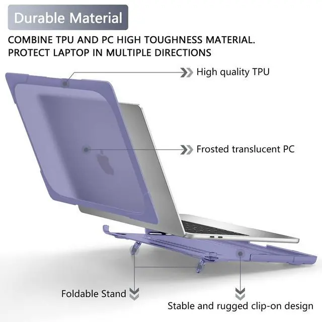 MILITARY-GRADE HYBRID ARMOR- A true heavy-duty hybrid fortress built for users who carry their MacBook everywhere. Features a scratch-resistant matte PC back paired with a thick, shock-absorbing TPU bumper. Reinforced Airbag corners disperse impact from real-world drops, backpack pressure, and daily accidents protection designed to survive travel, not just desk use. ^^ ALL-IN-ONE ERGONOMIC WORKSTATION Ditch your bulky metal stand. The built-in Invisible Foldable Kickstand raises your screen to a comfortable eye level, reducing neck strain during long work, study, or coding sessions.