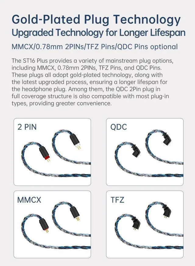 2-meter length Long IEM CableThe ST16 Plus replacement cables for kz cca or other brand earbuds comes with a 2-meter cable that provides users with a high-quality audio transmission solution for those who require longer distances or prefer not to use Bluetooth. When the 1.2 -meter earphone cable is not long enough to meet your needs, the 2-meter can accommodate a wider range of usage scenarios. ^^ Improvement on Sound QualityThe ST16 Plus in-ear replacement earphone cable adopts 16-core 5N high-purity single-crystal copper-silver plated wire cores, totaling 224 cores per strand. The fusion of single-crystal copper-silver plated wire fully leverages the advantages of copper and silver metals: Copper provides powerful low-frequency and cohesive mid-frequency, while silver enhances the high-frequency performance details, making the audio more vivid. The high-purity material can improve the transmission performance of the wire. The 23AWG diameter and 16-strand braided structure produce finer sound quality. ^^ Soft Cable with Long-Lasting LifeThis iem detachable cord adopt The one-piece injection molding process and Passed high intensity tension test, Long-lasting and durable. the soft and comfortable ear hooks accurately match the shape of the auricle of the human ear, so that every music lover can wear it comfortably, special braiding technique let it looks sophisticated but also elegant and neat in look. It feels soft and easily be stored without any tangling. You can wear it no matter youre enjoying music quietly or doing sports. ^^ MMCX/2PIN/TFZ/QDC Pins OptionalThe ST16 Plus iem extension earbud cable provides a variety of mainstream plug options, including MMCX, 0.78 mm 2PINs, TFZ Pins, and QDC Pins. These plugs all adopt gold-plated technology, along with the latest upgraded process, ensuring a longer lifespan for the headphone plug. Among them, the QDC 2Pin plug in full coverage structure is also compatible with most plug-in types, providing greater convenience.
