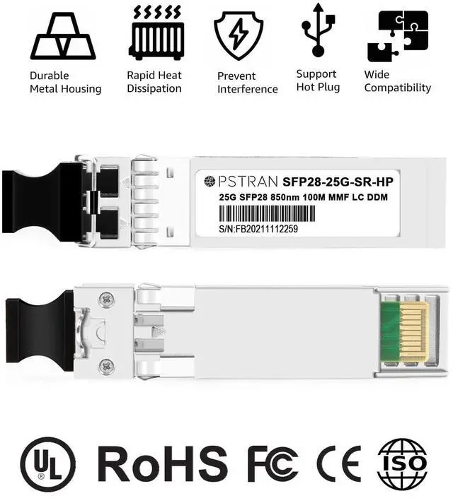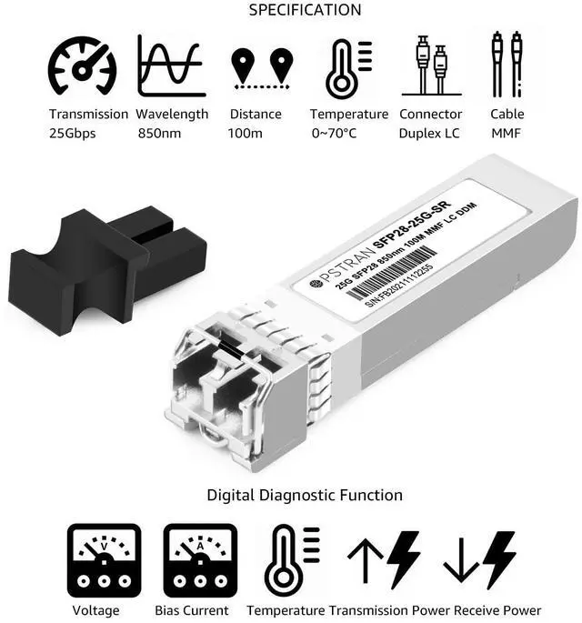 25GBASE-SR SFP28 Optical Transceiver Module 850nm 100m DDM Duplex LC MMF. Built-in high performance Chip, Max. Power Consumption 1W Allowing for Prolonged Service Life, Commercial Temperature Range 0 to 70C (32 to 170F) ^^ Tested in Targeted Switches for Superior Performance, Quality, and Reliability. We owns compatibility LAB facilities to meet the EEPROM coding and writing requirements with various brands of the latest and advanced networking equipments to ensure the reliability. ^^ Built-in Real Time Digital Optical Monitoring Capability for Strong Diagnostic Capabilities ^^ Support 4x25G Fan out and Easy Migration to 100G Platforms.