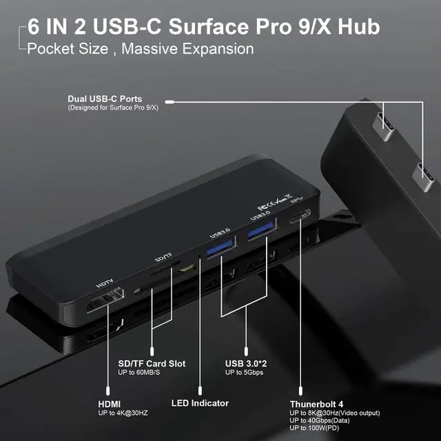 Video OutputSuperSpeed Data Transfer: USB-C Thunerbolt 4 Port40Gbps High Speed Data Transfer. 2* USB 3.0 PortMaximum Data Transfer Rate 5Gbps. Transfer a movie in seconds. SD&TF Dual Card SlotCompatible with SDXC, SDHC, SD, MMC, RS-MMC, TF, Micro-SDXC, Micro-SD, Micro-SDHC, Mini-SD and UHS-I cards up to 2TB, allow easy access to files with speeds up to 480Mbps. Perfect CombinationSpecial bevel-side and compact design of this docking station perfectly match your Surface pro 9/10/11/X. Aluminum case protect the shape and easily release heat. Just plug and play, no driver needed