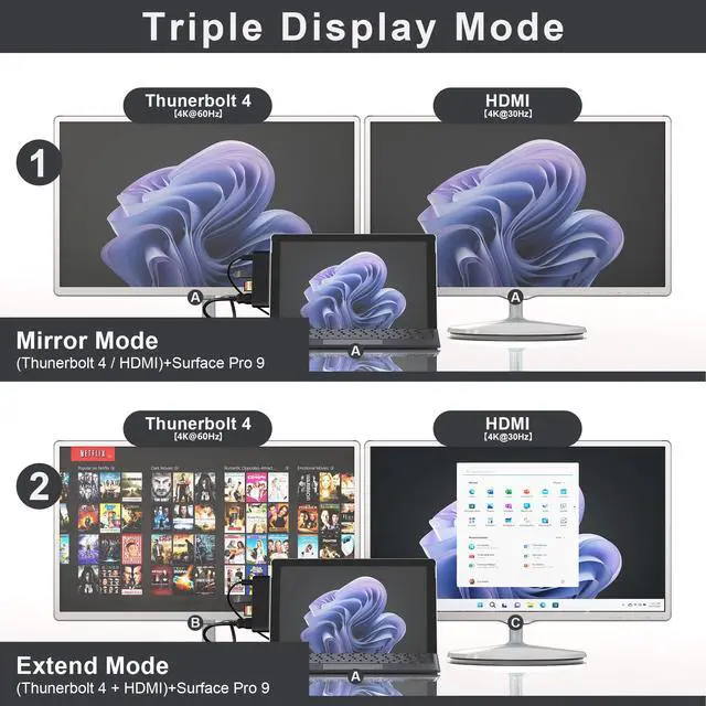 GoTriple display flexibility: Triple display ( 4K HDMI + USB-C Thunerbolt 4 ) + Surface Pro 9/10/11/X modes Boost your efficiency 3 times. Support Extend Or Mirror Mode, HDMI Resolution up to 4K@30Hz, USB-C Thunerbolt 4 resolution up to 8K@30Hz4K