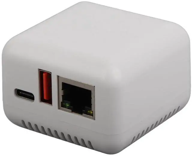 ^^ MULTIPLE INTERFACES: Computer print server adapter with Type C power supply port, printer USB connection port, and network cable interface.