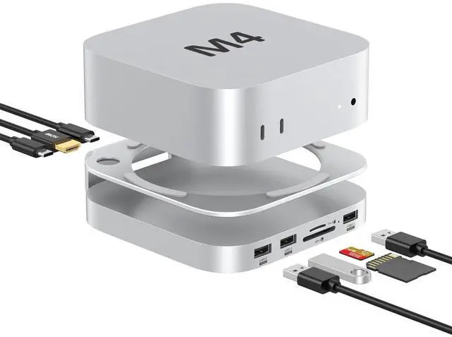 Please note: SSD is not included. ^^ Triple USB-A and Card ReaderThis Mac Mini M4 accessories equipped with two high-speed 10 Gbps USB-A ports and USB 2.0, also including extra SD/TF card reader, This M4 mac mini hub ensures seamless connections to peripherals like keyboards, mice, external drives, and more. ^^ Optimized CoolingOur new mac mini dock features a stand with an advanced heat dissipation design wtih 3.6 cm ( 1.42 inches) space, upon the dock to improve airflow and maintain optimal performance during Mac mini intensive tasks. ^^ Compact, Stylish, and