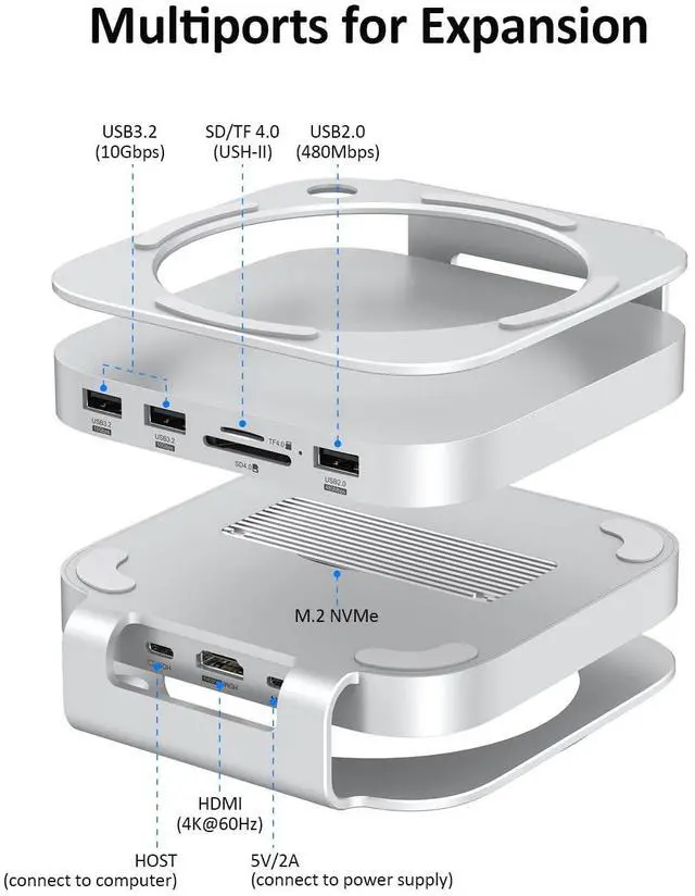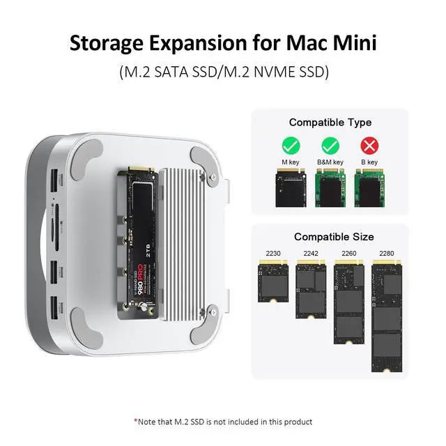 Stand in-One Design: Such Mac mini dock features with triple USB-A portsM. 2 NVMe SSD enclosure and SD 4.0 /TF 4.0 card reader, which special designed for Mac Mini M4 and M4 Pro. Combines a sleek stand and multi-port hub to enhance your new Mac Mini 2024 functionality while keeping your desk organized. ^^ Internal Storage ExpansionThe Mac Mini docking station supports M. 2 SSD ( ONLY for NVMe PCIe) to maximize your Mac Mini M4s capabilities with a revolutionary USB C hub, up to 10Gbps speed and 8TB capacity. Fitting 2230, 2242, 2260, and 2280 SSD.