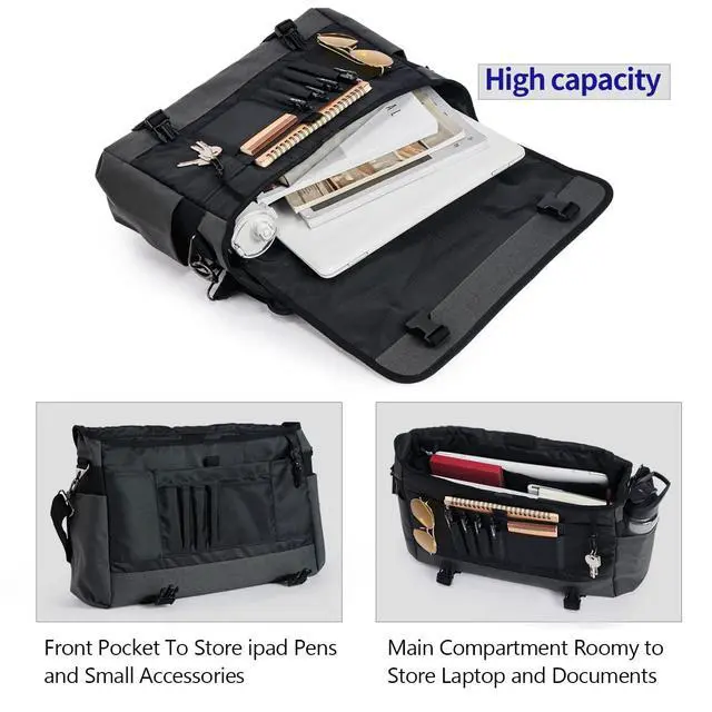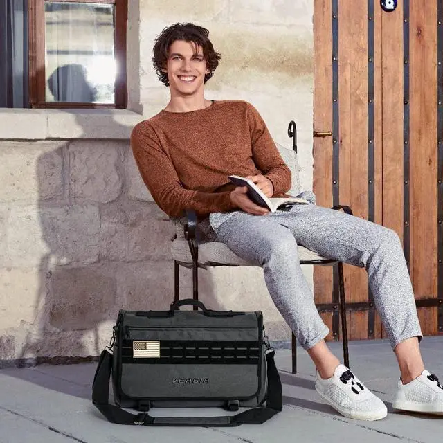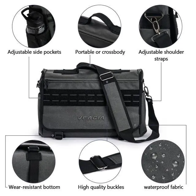 DescriptionVEAGIA BrandSize: 17X12X5 inch17 inch military laptop bag messenger bagFeatures: 1) VEAGIA messenger bag is imported from the latest high density 1050D Waterproof nylon, more wear-resistant, waterproof inner layer is protected with 400D Unigel effect. Firmness, abrasion resistance, zipper and Velcro design add long-lasting performance. 2) The main compartment has a bumper foam pad that can hold up to a 17-inch laptop or iPad to prevent accidental bumps. Load multiple bags in the front, but hide/protect them under the inconspicuous flap. 3) messenger bag men, two side pockets are designed to store water bottles and umbrellas. 4) men messenger bag, can