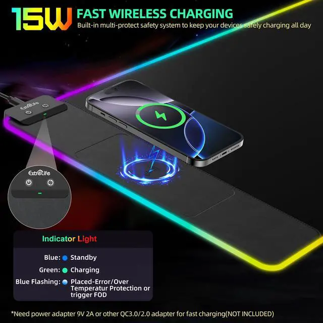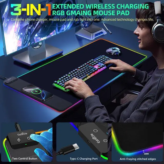 Best Control: ExtreLife extended mouse mat is made of high elasticity natural rubber, this mouse pad with wireless charger is non-toxic and has no hazardous substances, safe for use. Anti-slip base can firmly grip your desktop and nylon stitched edges make the desk pad much more durable and longer lasting. Easily roll up the desk pad without getting wrinkless or creases.
