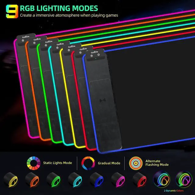 LED backlight mouse pad: Our rgb mouse pad provides 7 static modes and 2 dynamic modes will give you the options you are looking for. Personalize the lighting modes to create a visually stunning gaming experience. RGB desk mat with LED lights adds a touch of style to your gaming or office area. One button controls all light modes, press once to switch light color, double press to flashing light, long press to gradual lighting. ^^