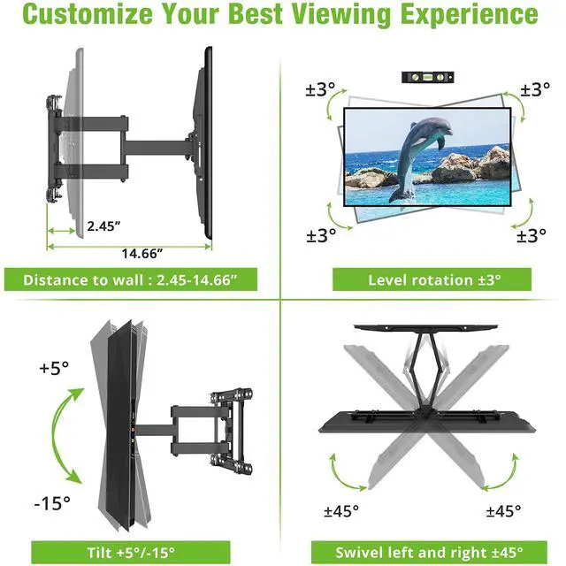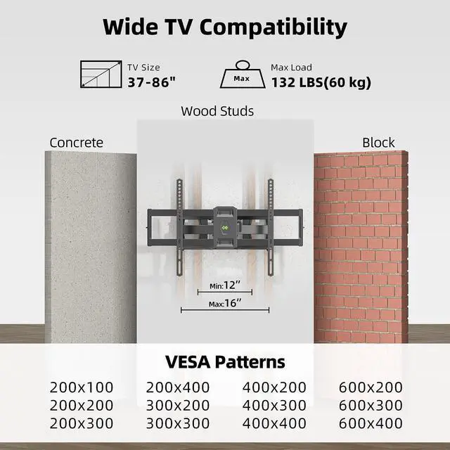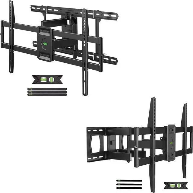 COMPATIBLE TV SIZEXML006-24K TV wall mount fits most 42-85inch TVs with VESA sizes available from 200x100mm to 600x400mm and a Max load of 110lbs. XML032-K TV wall mounts for 37"-86" TVs up to 16" wood studs, weight capacity of 132 lbs. with VESA 200x100mm to 600x400mm available. ^^ FLEXIBLE MOVEMENTPut the TV at any angle you want to watch with smooth movement. Full motion TV mount provides you +5/-15 tilting, +/- 45 swivel, and leveling +/-3 angles. Extending up to 16.67 inches, retract back to a low profile of 2.58 inches.