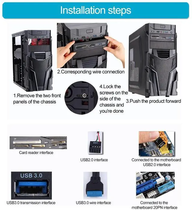 Great performanceOur Internal Card Reader Dashboard is designed for optimal performance and multi-functional purposes. High speed front USB 3.0 interface for an efficient and effortless data transfer. ^^ Fully equipped Our Internal Card Readeris internal usb hub comes fully equipped with 6 card slots offer quick and easy access to the most common-used card formats. ^^ Loaded support Our Internal Card Reader is Support M2, SD, MS, XD, CF, TF card and the capacity is 64G. Copper plated card slots to ensure stability while transferring. ^^ WIDE COMPATIBILITYOur Internal Card Reader Dashboard can be easily and neatly installed into a 5.25" drive bay on your desktop to give you convenient access.