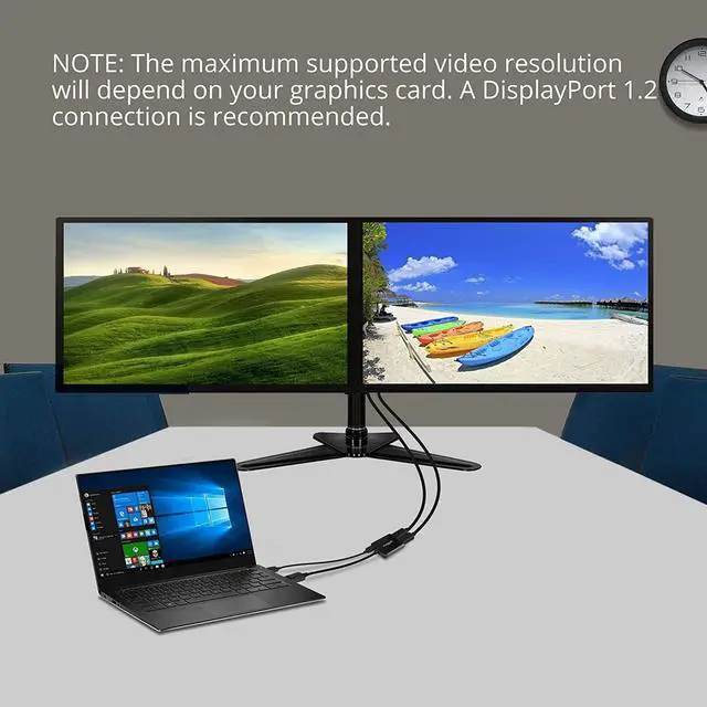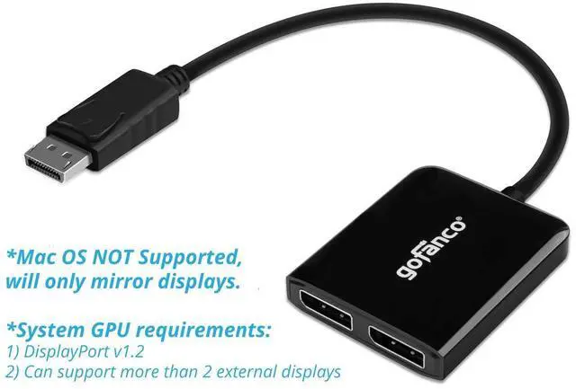 *IMPORTANT NOTES* 0) Please check image #4 closely before purchase! 1) DisplayPort 1.2 GPU/Graphics card required ^^^^ 2) Requires GPU/Graphics card supporting more than 2 external displays ^^^^ 3) Intel HD Graphics are limited to 3 external monitors altogether ^^^^ ** See Product Description for more important information. Contact us before purchasing if you are not sure about compatibility ^^ 2 EXTERNAL DISPLAYS Connect two displays to your system through a single DisplayPort 1.2 output; work as a splitter, extended mode, or expand mode joining multiple screens together as one display.