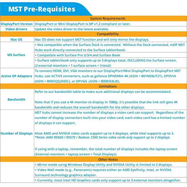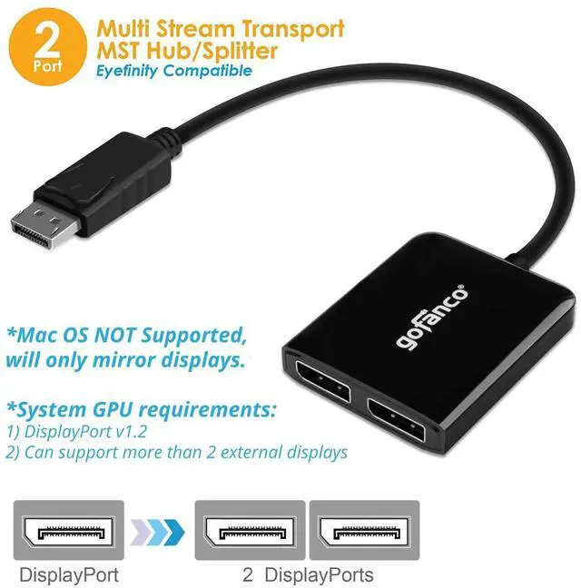 VGA: B00R3I3LIK) ^^ HIGH RESOLUTION Supports up to 4K @30Hz. A DisplayPort v 1.2 output or later is required for full functionality. With DisplayPort v 1.1 or earlier, the MST function is disabled and the hub becomes a Splitter, mirroring your video source across all displays ^^ Eyefinity SUPPORT Active converter ensures compatibility with AMD Eyefinity technology to support multi-screen SLS gaming and digital signage applications. Supports Windows PCs with no driver installation required. *Mac OS* does not support MST function and will only mirror the displays ^^ SIMPLE INSTALLATION Supports Windows PCs with no driver installation required. *Mac OS* does not support MST function and will only mirror the displays. FCC, CE & RoHS compliant. Our products are backed with a 1-year limited warranty and experienced tech support team in Silicon Valley. If you have any questions or concerns, visit our gofanco website or click on our name in the buy box and select "Ask a Question".