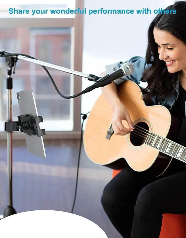 ^^ Easily Rotatable & Adjustable 360 degree rotation tablet support holder, can provide the best viewing angle. Simply adjust your tablet and place it at any angle and position you desired. You wont have to bend your neck down all the time as you enjoy music. The microphone and stand in the picture are for demonstration purposes and are not included in the package. ^^ Secure Stable This tablet mount is covered by anti-skid silicone, is extremely strong and durable, providing maximum protection for your device from any scratches, not drift down when you touch it or use it, woleyi holder provides safe and secure support for your device.