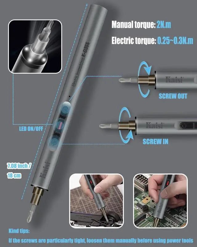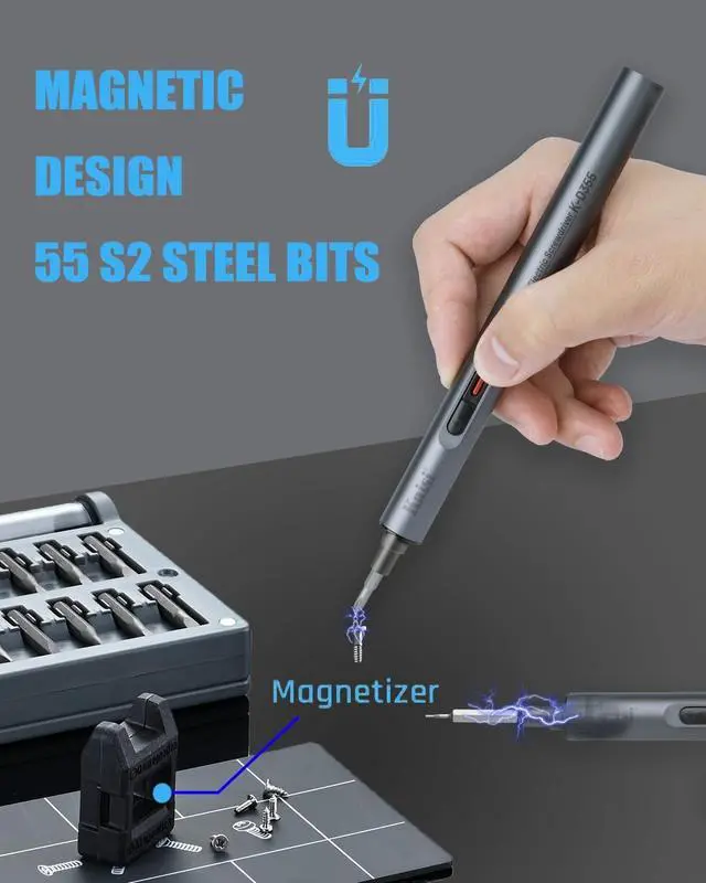 55 Pcs S2 Steel BitsOur mini electric screw driver set includes a total of 55 bits made of reliable S2 steel material and CNC machined to ensure durability and effectiveness, making it versatile and suitable for repairing a wide range of electronic products, such as PC computers, laptops, cell phones, remote controls, drones, watches and glasses.