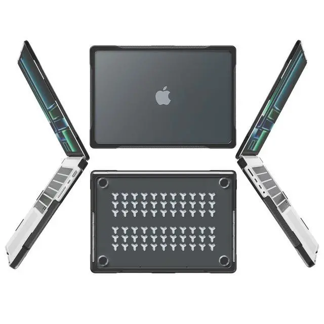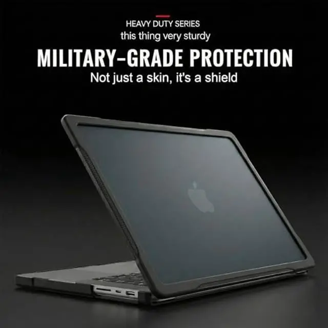 Structure": a scratch-resistant Polycarbonate (PC) hard back fused with a shock-absorbing TPU bumper. The reinforced corners act as airbags for your Mac, absorbing impact from accidental drops and knocks. Its not just a cover; its insurance. ^^ ENGINEERED DENSITY ( 0.8 LBS OF REAL SAFETY) [HONESTY ALERT] Real protection has mass. We prioritized density over thinness to ensures the heavy-duty bumpers are thick enough to actually work. the top and bottom covers together weigh approx. 370g( 0.8 lbs). If you want featherweight slim cases that crack easily, this isn't for you. But if you want a case that feels like a shield, youre in the right place. ^^ TACTICAL GRIP & MATTE FINISH Say goodbye to the slippery, fingerprint-magnet aluminum body. Our translucent matte finish resists oily smudges (perfect for Midnight color users) while preserving the Apple logo's visibility. The edges feature a rugged Carbon Fiber texture, providing superior friction ensures a secure, non-slip hold for one-handed carrying during commutes or field work. ^^ Y-VENT COOLING & PORT ACCESS Designed to keep your pro machine running cool. The bottom features raised rubberized feet and engineered Y-vents to maximize airflow.