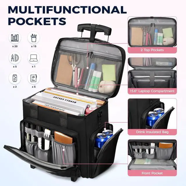 Set Includes Tote: Rolling teacher bag with wheels includes a portable teacher file tote bag ( 11.75" L x 11" W x 4" H), which is suitable for quick classroom errands or separating personal items. You can store various items according to different needs, teacher items such as laptop, books, file, and personal items such as lunch box, mobile phones, water glasses, umbrellas, etc ^^ Thoughtful Design & 3-Way to