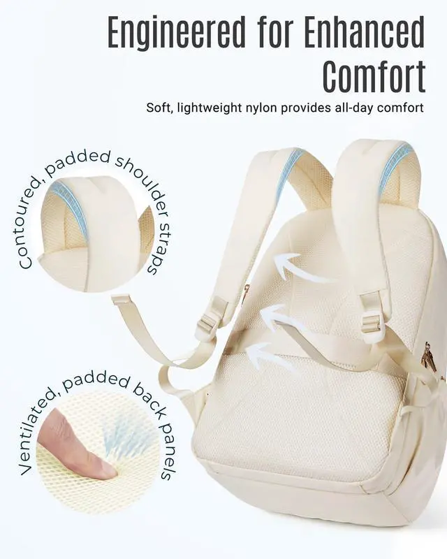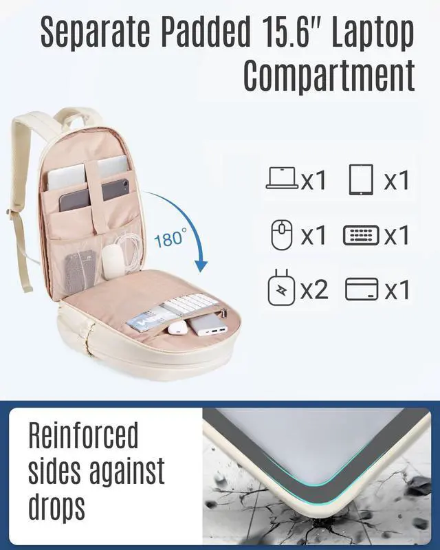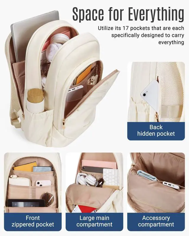Thoughtful Storage SolutionsElevate your travel experience with this women's travel backpack. College backpack boasts 17 pockets across 4 compartments, ensuring that all travel accessories stay organized and within reach ^^ Large CapacitySeparated laptop compartment features a 180 opening for easy access and can accommodate up to a 15.6 -inch laptop, tablets, and tech accessories. Backpack for women is designed to fit daily essentials in the roomy main compartment, including A4 folders, magazines, textbooks, chargers, power banks, and clothes. Complemented by two front compartments with a key fob hook, pockets, and many small pockets.