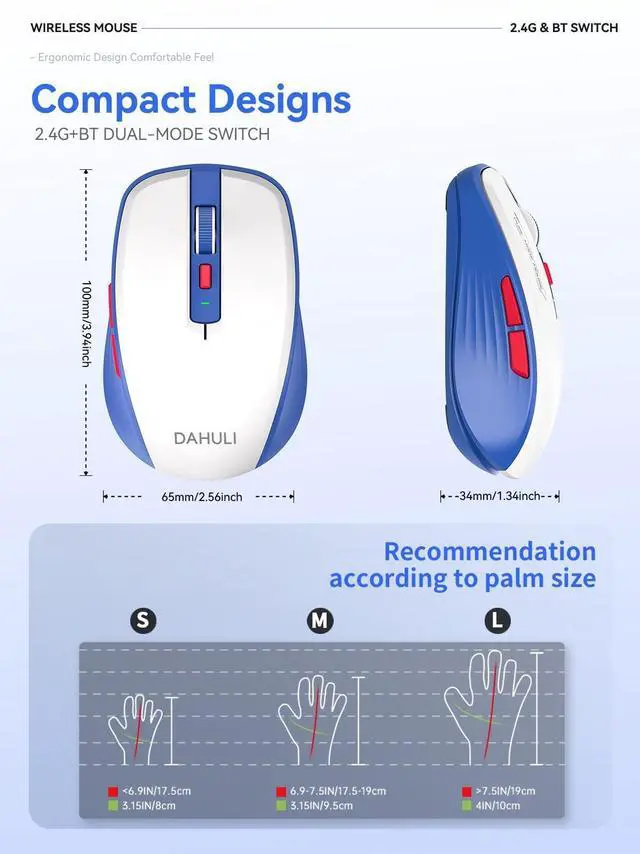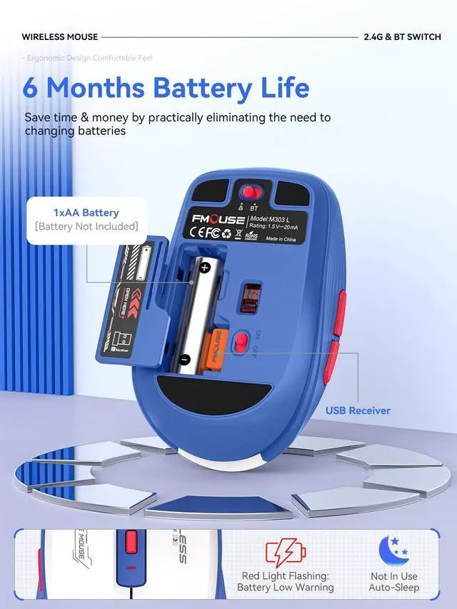 This tri-mode wireless Bluetooth mouse combines Bluetooth 5.1, 2.4GH z USB dongle, and USB-C dongle connectivity for seamless switching between three devices with a single click. Featuring forward/backward shortcut keys and silent click technology, it delivers efficient, distraction-free operation. The ergonomic design ensures comfort during extended use, while the dual-tone mechanical aesthetic adds a stylish touch. With four adjustable DPI levels (2400/1600/1200/800), it adapts to tasks from precise photo editing to fast-paced gaming. Powered by one AA battery (battery not included), this portable mouse works with PCs, Macs, laptops, tablets and supports Windows, macOS, Linux, Chrome OS.