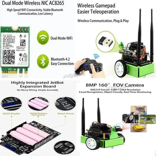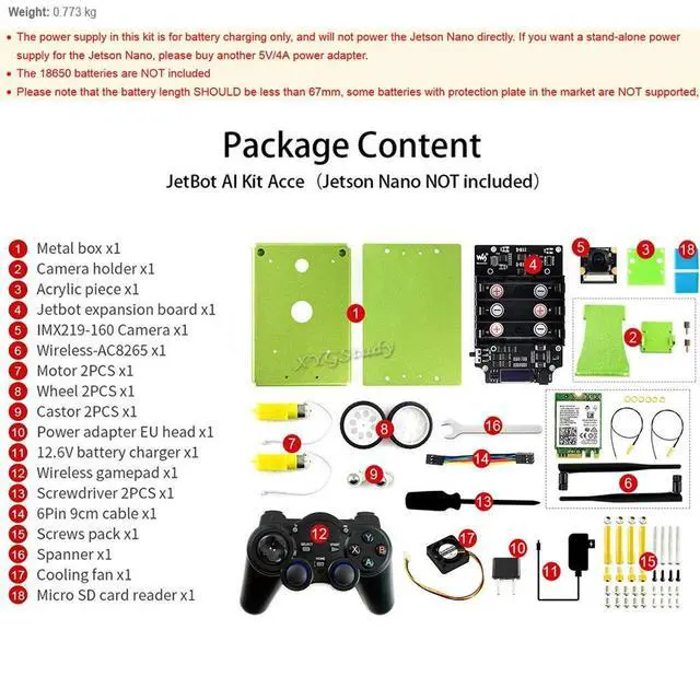 Package Contains: Metal box x1Camera holder x1Acrylic piece x1Jetbot expansion board x1IMX219-160 Camera x1Motor 2PCS x1Wheel 2PCS x1Omni-direction wheel 2PCS x1Power adapter EU head x 112.6V battery charger x1Wireless gamepad x1Screwdriver 2PCS x16Pin 9cm cable x1Screws pack x1Spanner x1Cooling fan x1Micro