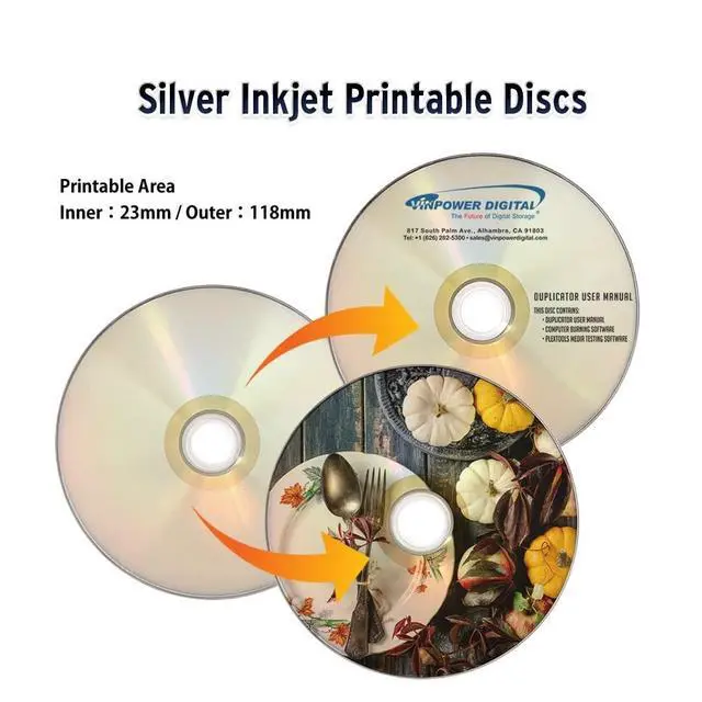 PlexDisc recordable DVD media offers superior quality and performance. They are perfect for recording movies, files, games, and more. The PlexDisc recordable DVD media is affordable and works in a wider array of duplication and recording devices compared to cheaper, less reliable media options. Plus, the silver inkjet printable surface works across all known optical disc inkjet printers providing a vibrant printed image that can cover the entire disc surface to the center hub. The colors are more colorful and the Black is more pronounced with the PlexDisc 16x 4.7GB Silver Inkjet Hub Printable DVD-R media.
