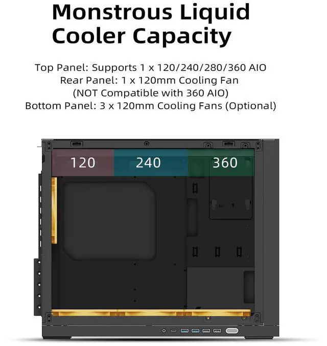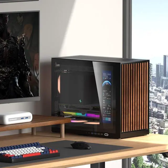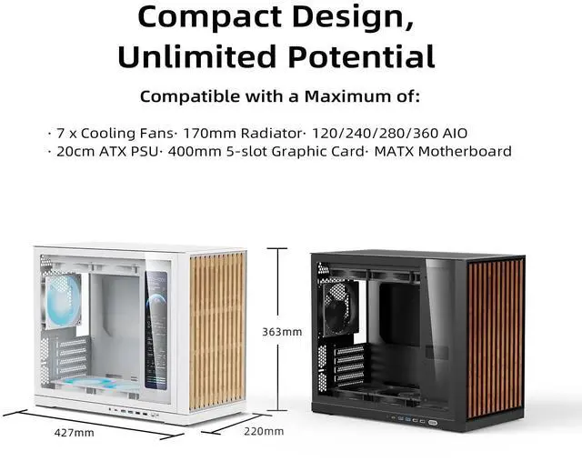 11.3" IPS Hardware Dashboard - 1920480 resolution monitoring screen via USB 2.0. Displays real-time CPU/GPU temps, clock speeds, and fan RPM with 20+ customizable themes (support DIY themes). Screen panel conceals PSU wiring clusters, paired with walnut/birch wood front for seamless aesthetic integration. ^^ Advanced Dual-Loop Cooling - Compatible with 7x120mm fans (3 top/3 bottom/1 rear) / supports 360mm AIO at top/bottom / 120mm AIO at rear. Lab-verified thermal efficiency for sustained high loads. ^^ Compact Flagship Build - Houses 400mm 5-slot GPUs and 170mm CPU coolers in 34L volume (427x220x362mm).