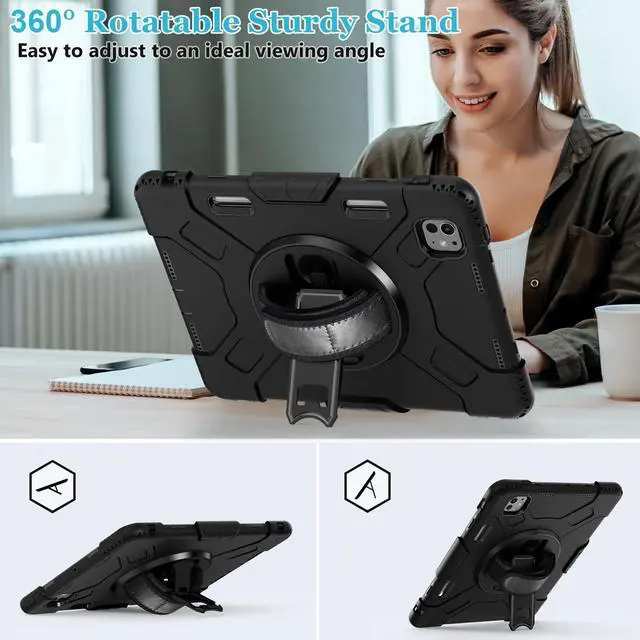 ^^ 360-DEGREE ROTATING/MULTI-ANGLE STAND: The case for iPad Pro 11 2024 5th Generation features a built-in 360-degree swivel foldable sturdy kickstand. It supports multiple viewing angles, both vertical and horizontal, making it ideal for watching videos, attending conferences, typing, and drawing, all while keeping your hands-free. This sturdy kickstand can be easily folded when not in use.