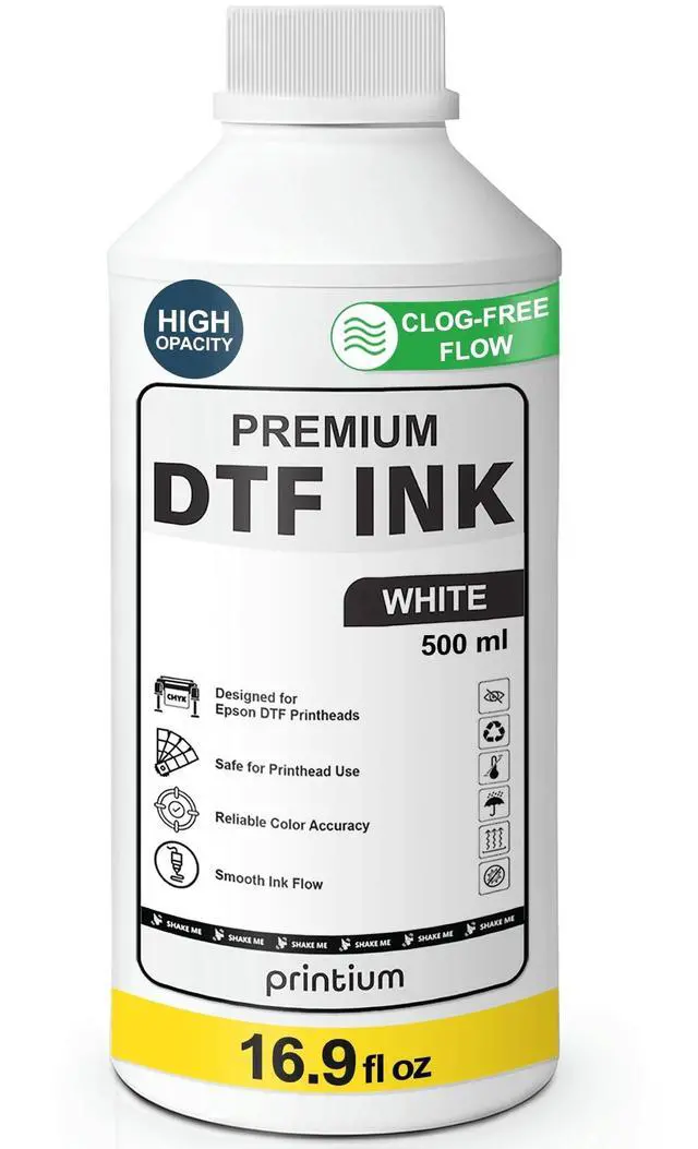 • HIGH OPACITY WHITE DTF INK FOR BRIGHT PRINTS : Printium DTF Ink White delivers ultra-opaque, vivid results on both dark and light garments. Perfect for PET film heat transfer printing, it provides sharp detail, smooth laydown, and long-lasting vibrancy on cotton, polyester, blends, jeans, leather, nylon, and canvas. Ideal for t-shirts, hoodies, and custom DTF projects. Also suitable for older DTG systems converted for DTF printing.