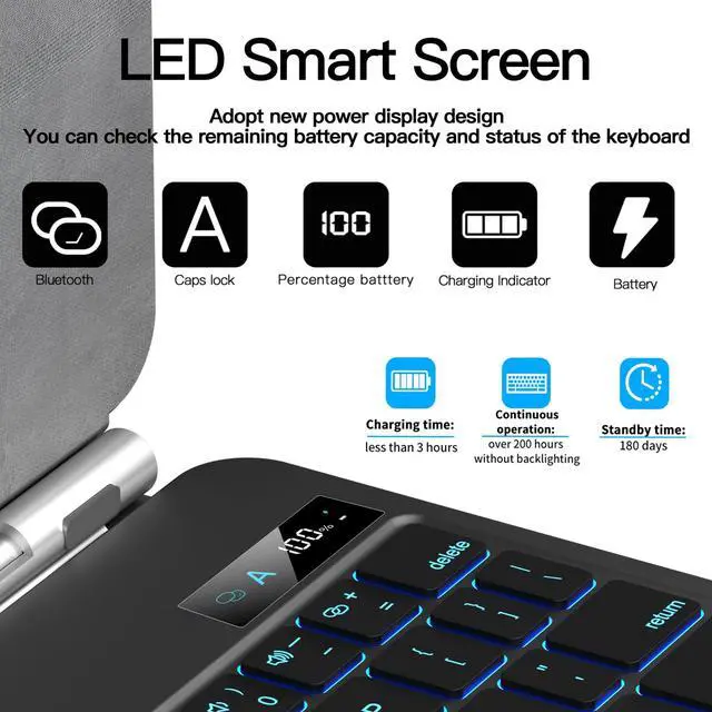 Display & RGB Backlit]: The LCD allows you to check battery level, capital letters, and BT pairing status at a glance. With a 500mAh battery, the magic keyboard iPad Pro 11 works for more than 200 hours without lighting. The backlit keyboard comes in 7 colors, 3 brightness levels, and colorful breathing modes, with high brightness> 5.5 hours, medium brightness> 7.5 hours, and low brightness>13 hours. Backlight mode auto turns off when the display brightness is less than 15%, and the keyboard can work continuously for more than 20 hours. ^^ [Protective iPad