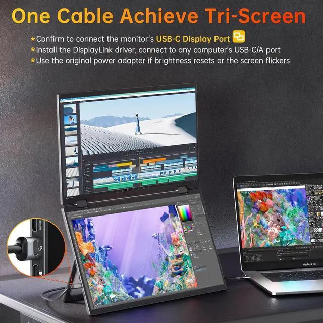 Accessories Included: Equipped with a USB-C Display Port, USB-C power port, and dual Mini-HDMI ports, this dual monitor connects effortlessly to laptops, desktops, and mini PCs. All necessary accessories are included in the box: USB-C to USB-C cable, USB-A to USB-C cable, two HDMI to Mini-HDMI cables, a dedicated power adapter with cable, and a sleeve case. Everything you need for a complete workstation setup without purchasing extra cables. ^^