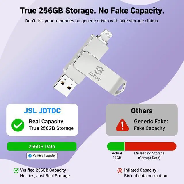 Genuine Apple MFi Certified - Officially licensed by Apple for 100% compatibility & safety. No data corruption or iOS errors like uncertified iPhone USB Flash drives. Your Precious data deserves Real MFi protectionno shortcuts, no lies. Just reliable Real Apple MFi Certified Photo Stick for iPhone and iPad. ^^ True Storage Capacity No Fake Size Real 256GB capacity with no hidden formatting loss. Instantly check available space via the app. Give your iPhone and iPad Real External Storage. ^^ 1-Tap & Auto Backup Photos/Videos Free Apple MFi certified app lets you back up your entire iPhone or iPad gallery with one tap or set automatic backups to free up space, you can also store your own backup on your computer with the USB side for Double Insurance.