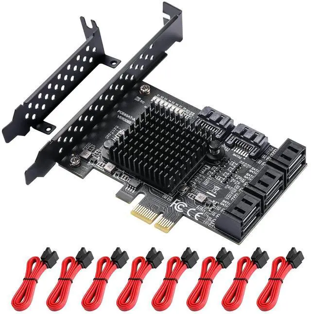 With this PCIe SATA card, you can add 8 SATA 3.0 6 Gbps devices to your computer. ^^ The PCIe SATA card contains 8 SATA cables to simplify the connection and low profile bracketNeed change to the low profile braket when works on slim size PCs. ^^ The adapter is well made, providing stable and effective data loss control. And it supports hot swap. ^^ Use the premium ASMedia ASM1064+JMB5XX chip to improve card stability and compatibility. ^^ Connect 8 mass storage devices at the same time. Compatible with Windows /8/10 Ubuntu.