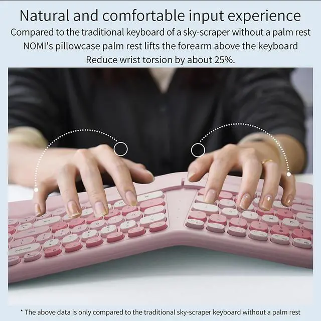 MEMBRANE ERGONOMIC KEYBOARDSplit and sloping keyboard design matches your arms and hands. The low keys can be activated with a light press, reducing typing stress. The integrated wrist rest supports your wrist in a comfortable position. This carpal tunnel keyboard allows you to type in a more natural posture, reducing muscle strain in your wrists and forearms. ^^ WIRELESS CONNECTION 2.4G wireless transmission technology, the maximum transmission distance can reach 10m. The wireless connection solves the desktop clutter problem caused by the data cable, suitable for those who like to have a neat desktop.