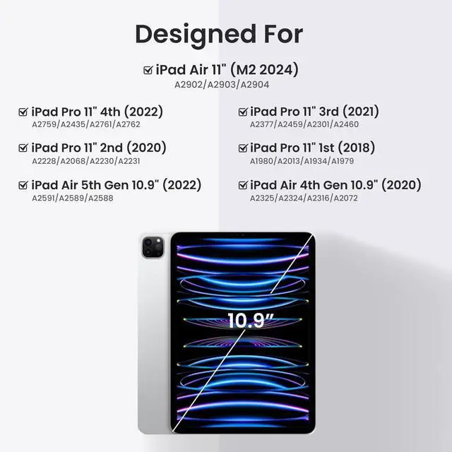 Keyboard 2018: A1980/A1934/A1979/A2013. (NO PEN included) ^^ KEYBOARD CASE WITH PENCIL HOLDERFor iPad 10.9 inch Air 5th generation 2022 keyboard case built-in iPad pencil holder, cap & adapter slots, easily to carry your iPad pencil with your device(ipad pencil, cap & adapter not included). Hole in top of pen holder for easy access to pen. Precise cutouts provide full access to all ports, user interface and functions (Cameras, Speaker, Charge port) ^^ DETACHABLE & BACKLIT BT KEYBOARDFor iPad air 5th Generation keyboard case is ultra-thin, The magnetic keyboard and case are separated, magnetically attached, the keyboard can be removed from the case. Picture yourself typing smoothly in the dark using the optional backlight mode one color at a time or constantly switching between 7 colors, provide all-day comfort for work and entertainment. The Keyboard can be attached to the case magnetically, if not needed, it can be removed ^^ HEAT RELEASE & ALL PROTECTION Smart cover for iPad 10.9 inch Air 5th Gen /air 4th Generation has full edge coverage. Keyboard case for iPad Pro 11" comes with honeycomb grid pattern design is better for heat release and anti-skid.