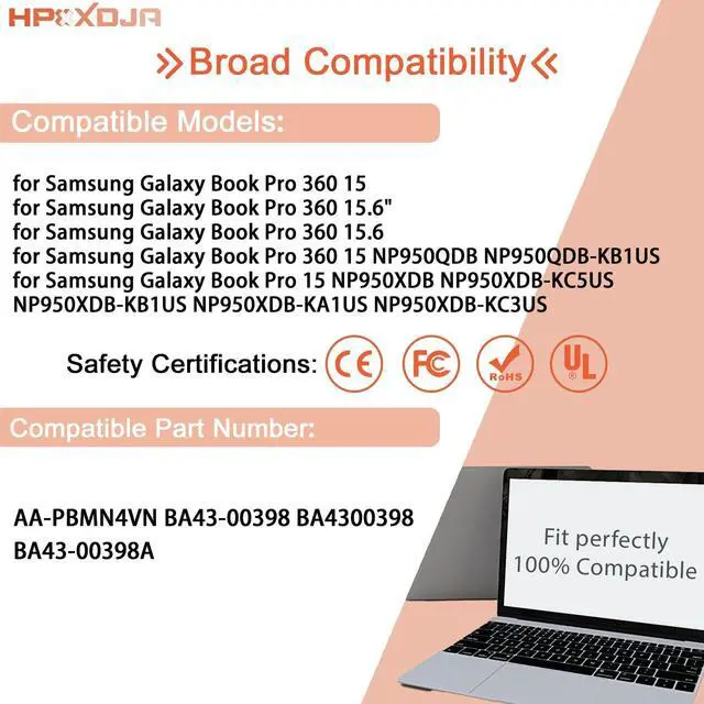 COMPATIBLE WITH: AA-PBMN4VN battery. for Samsung Galaxy Book Pro 360 15 Series. for Samsung Galaxy Book Pro 360 15.6 Series. for Samsung Galaxy Book Pro 360 15.6" Series. for Samsung Galaxy Book Pro 360 15 NP950XDB Series. for Samsung Galaxy Book Pro 360 15 NP950QDB Series ^^