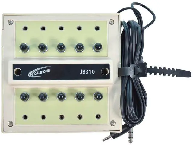 The Califone JB310 Jackbox has ten positions featuring silver-plated contact points for better connection and moisture resistance. Made of rugged plastic. The permanently attached cord is 6-foot with 3.5 mm stereo and 1/4 inch plugs for connecting to audio source. Includes a 3.5 mm input allowing it to daisy chain to another jackbox. Jackbox weighs 12 ounces and measures 2 inch H x 4-1/4 inch L x 4-1/4 inch D. 1 year warranty with school use.