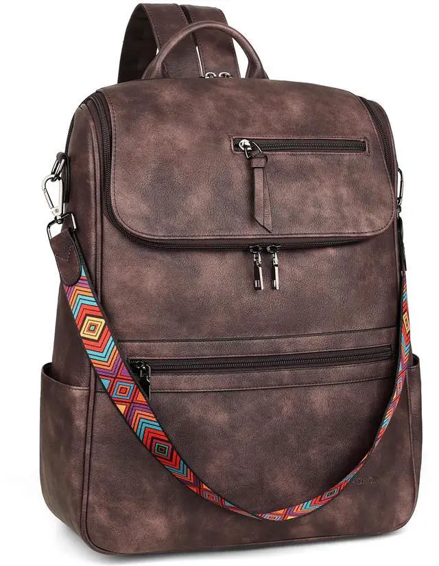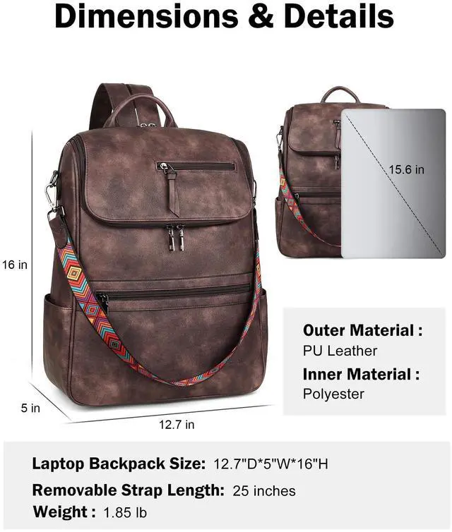 Quality Materials: 12.7"W *5"D*16"H, 1.85 lb. This women's leather laptop backpack is made of the latest waterproof PU vegan leather, soft and retro, quality hardware, smooth zipper without sticking, and reinforced design at the connection between the shoulder strap and backpack, making the leather backpack more durable. So this is a sturdy and stylish laptop backpack.