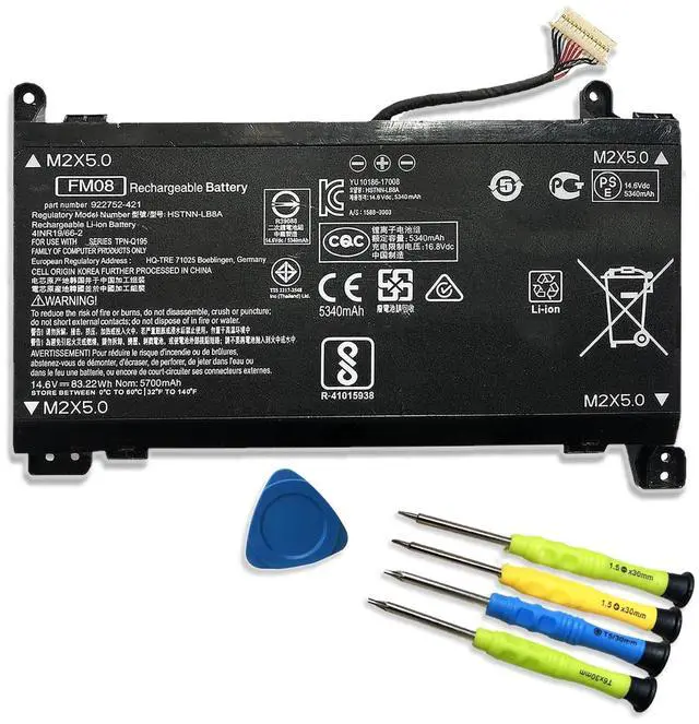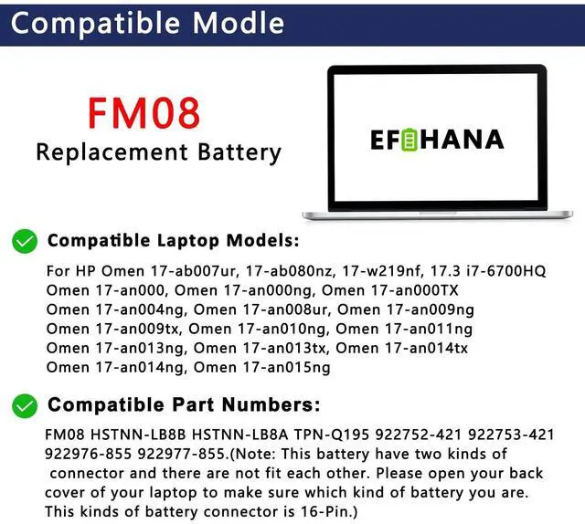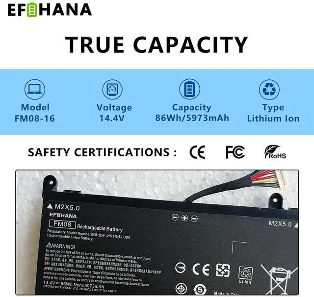 Capacity: 86Wh/5973mAh// 100% New from Manufacturer. Top circuit boards and smart chip. ^^ Compatible Part NumberFM08 HSTNN-LB8B HSTNN-LB8A TPN-Q195 922752-421 922753-421 922976-855 922977-855 ^^ Compatible with Laptop ModelsFit for HP Omen 17-ab007ur, 17-ab080nz, 17-w219nf, 17.3 i7-6700HQ, Omen 17-an000, Omen 17-an000ng, Omen 17-an000TX, Omen 17-an004ng, Omen 17-an008ur, Omen 17-an009ng, Omen 17-an009tx, Omen 17-an010ng, Omen 17-an011ng, Omen 17-an013ng, Omen 17-an013tx, Omen 17-an014tx, Omen 17-an014ng, Omen 17-an015ng. ^^ After ServiceReturn and exchange are permitted within 30 days, accompanied by a 12-month warranty.